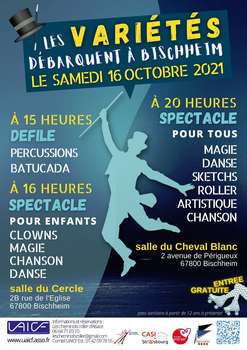 Le samedi 16 octobre prochain à Bischheim, préparez-vous à l’arrivée de 75 artistes issus de toute la France afin d'offrir aux petits et aux grands trois représentations distinctes dans le cadre du festival national de variétés de l’UAICF.